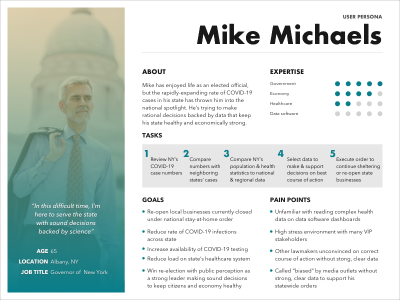 This redesign of the Johns Hopkins University COVID-19 dashboard optimizes the site for a previously atypical user group - political officials called to make life and death decisions about resource allocation and social intervention to mitigate disease transmission during a rapidly-progressing global health emergency. Interactive visualizations providing more data at-a-glance, including the ability to compare data across geographical regions, support well-informed, data-driven decision-making.